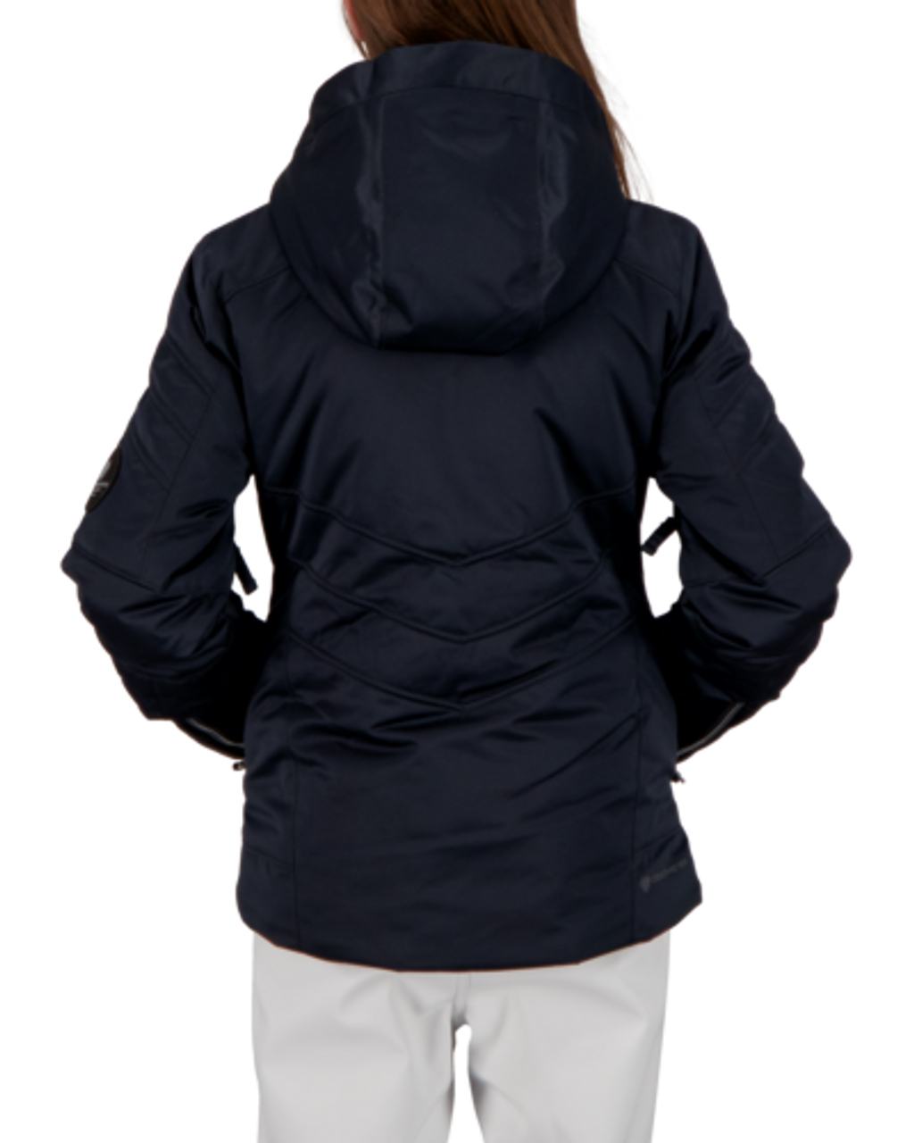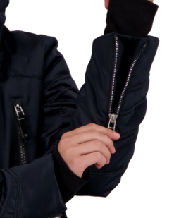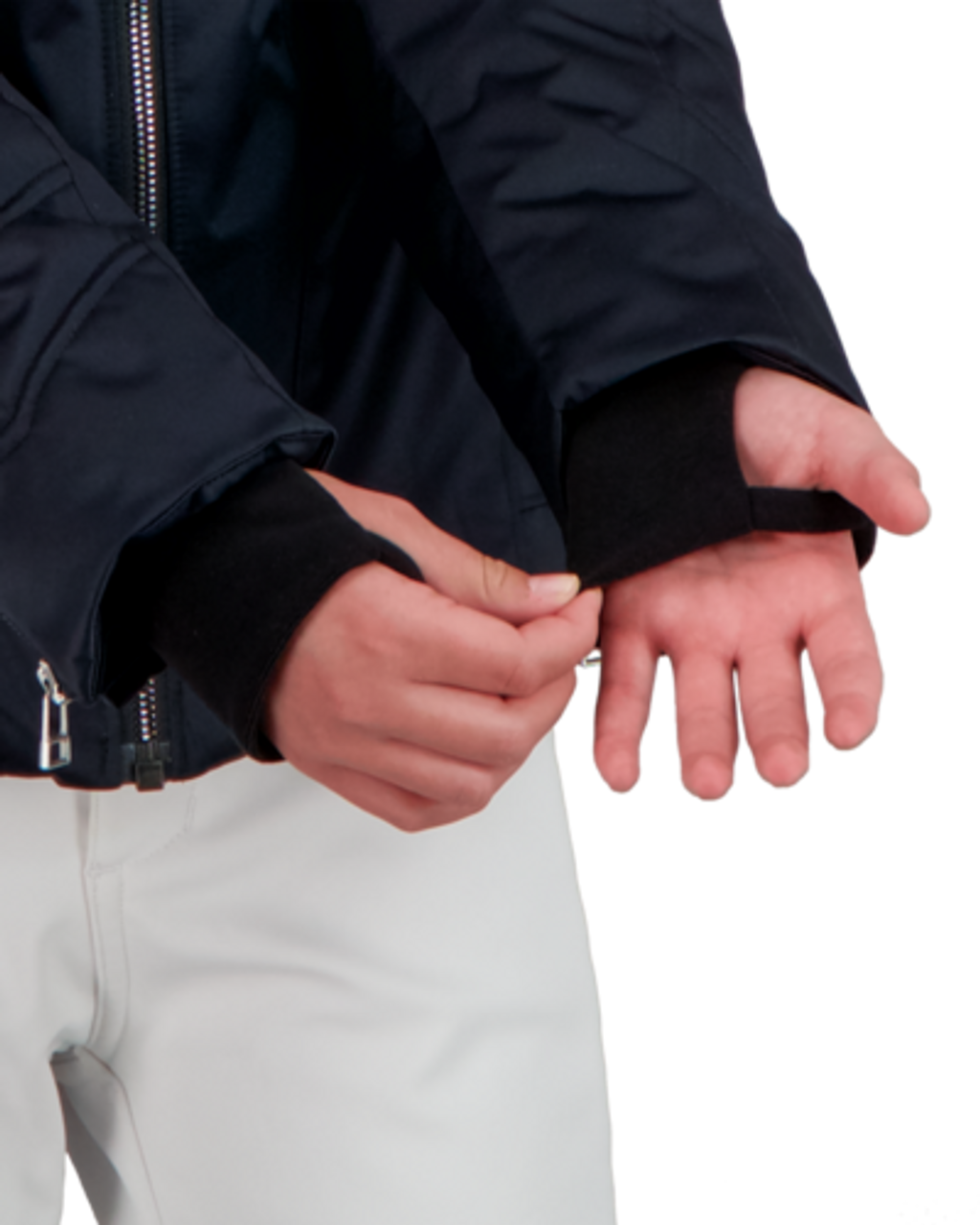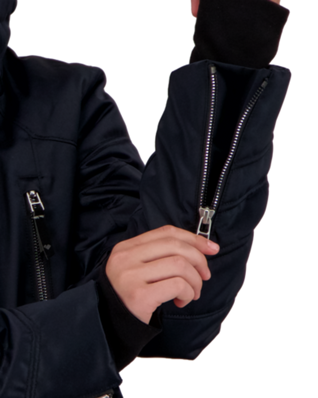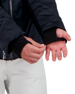 Metaluxe® zippers, shaped cuffs, and faux suede trim highlights. Exceptional weatherproof technology with HydroBlock Pro 15,000mm waterproof-breathable lamination and 140gm stay-dry insulation. Snap-Away powder skirt and removable hood for days around town with friends. Mesh gussets and underarm control zone ventilation regulate variations in temperatures. Secure interior electronics pocket for phone and music.